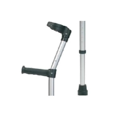 Canadiana de adulto com braçadeira fixa, punho normal. Regulável em altura na parte inferior. Ponteiras de 20 mm, disponivel em anodizado natural.
